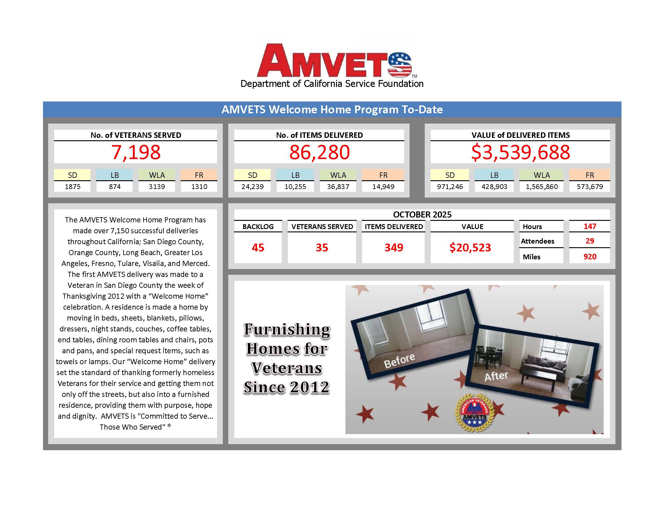 It is this gap that AMVETS™ seeks to close. Imagine being homeless and then being given an opportunity to get off the streets only to realize that although you have a roof and walls, you still don’t have the basic dignity of a bed or a sofa or even some dishes from which to eat. Thus, the AMVETS Welcome Home Program was established to fill this void. A partnership between the VA and the AMVETS Department of California Service Foundation, AMVETS provides furniture, small appliances, and other household items to formerly homeless Veterans.